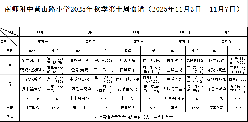 南师附中黄山路小学2025年秋季第十周食谱(2025年11月3日--11月7日)