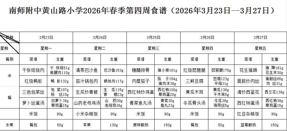 南师附中黄山路小学2026年春季第四周食谱(2026年3月23日--3月27日)