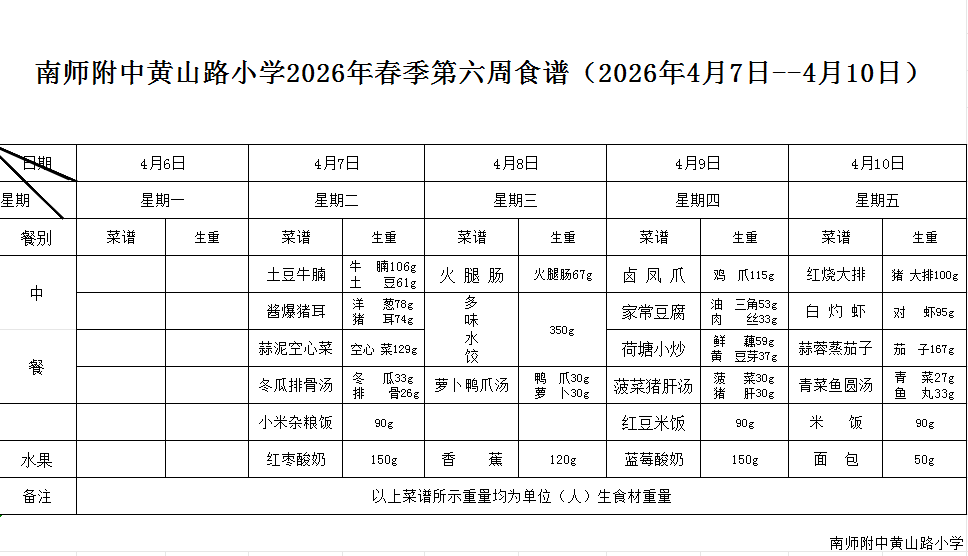 南师附中黄山路小学2026年春季第六周食谱(2026年4月7日--4月10日)