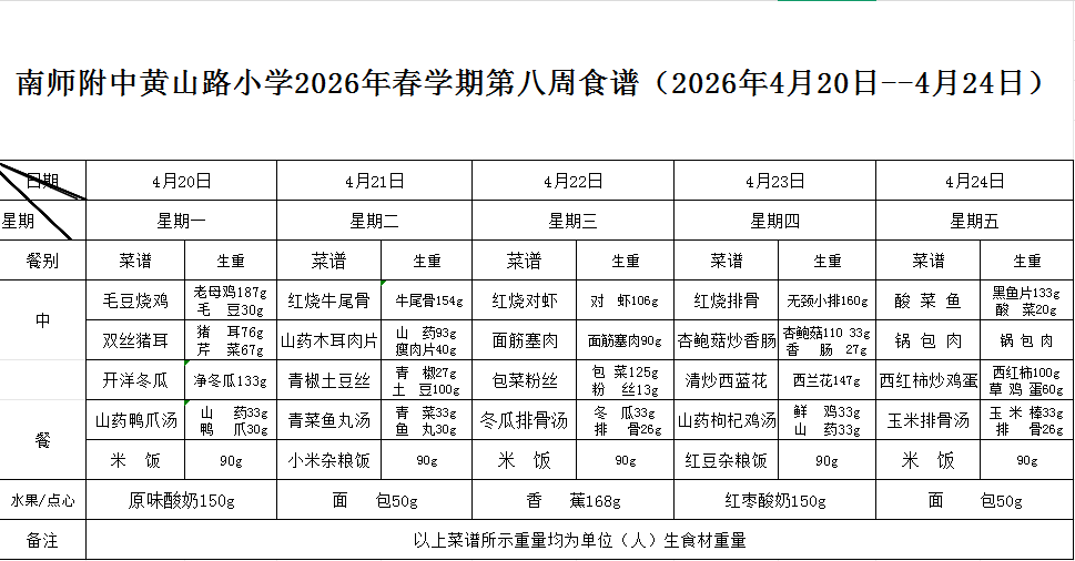南师附中黄山路小学2026年春学期第八周食谱(2026年4月20日--4月24日)